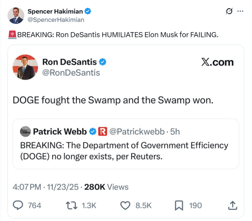 Florida Valisi Ron DeSantis, X adlı sosyal medya platformunda şu yorumu yaptı: "DOGE, Bataklık'la (hükümet yolsuzluğuna ve bürokrasisine gönderme yapan bir bataklık) mücadele etti, ancak Bataklık kazandı." Bu açıklama, şüphesiz DOGE'nin sonunu tarihi bir yenilgi olarak yorumluyor.