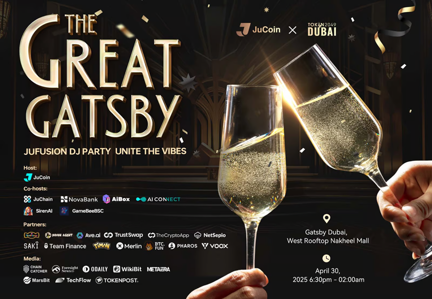 Heyecan dolu TOKEN2049 programının ardından JuCoin, 30 Nisan 2025 saat 18:30'dan ertesi sabah 02:00'ye kadar Dubai'deki şık Gatsby Dubai'de büyük bir temalı afterparty düzenleyecek. Muhteşem Gatsby'den ilham alan bu etkinlik, retro lüksü modern trendlerle bir araya getirerek yenilikçileri, yatırımcıları ve kanaat önderlerini bir araya getiren üst düzey bir Web3 sosyal gecesi yaratmayı amaçlıyor.