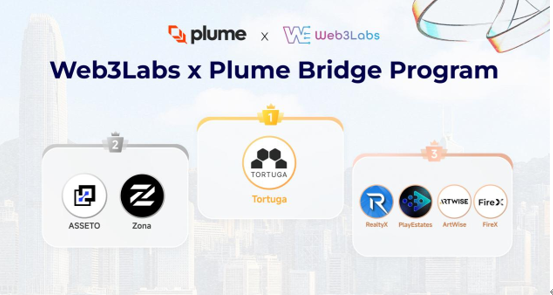 Temmuz 2025'te Web3Labs ve Plume , Web3Labs x Plume Köprü Programı için kısa listeye giren projeleri duyurdu . Bu iş birliği, kurumsal düzeyde gerçek dünya varlıklarının tokenleştirilmesine odaklanan ve geleneksel finans ile blok zinciri ekosistemi arasında uyumlu etkileşimi kolaylaştıran ilk köprü programını oluşturmayı amaçlıyor. İki aylık bir başvuru ve seçim sürecinin ardından Asseto, RealtyX, PlayEstes, Zona, ArtWise, FireX ve Tortuga, küresel RWA Köprü Programı için başarıyla kısa listeye alındı. Kısa listeye giren projeler, her iki taraftan da sektör ekosistemi kaynakları alacak ve resmi kuluçka ve hızlandırma aşamasına girecek.