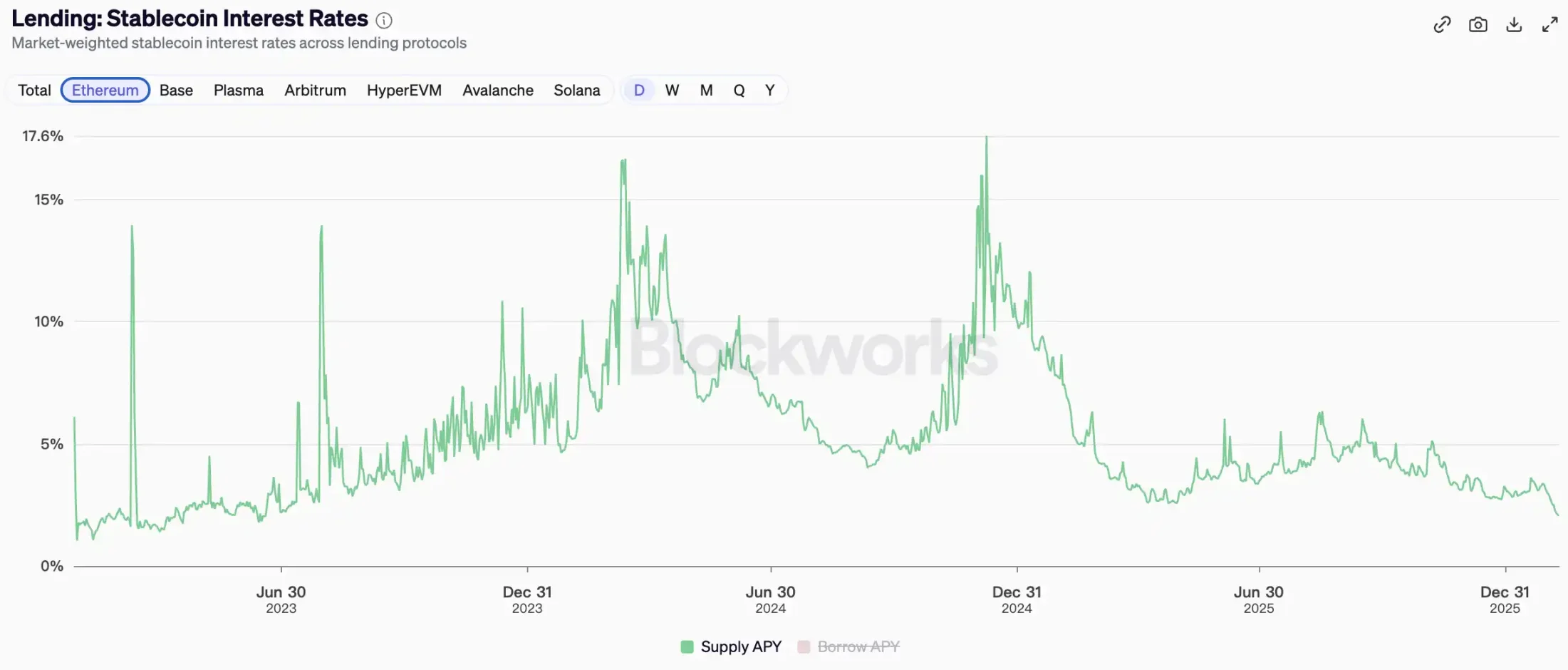 Üçüncüsü, gerçek bir borç verme talebi var. Ayı piyasası sırasında, yatırımcıların zincir üstü varlıklara olan maruz kalma talebi azalır ve bu da faiz oranlarının düşmesine neden olur. Stablecoin borç verme faiz oranları şu anda %2,3'e kadar geriledi ve son yılların en düşük seviyesine ulaştı.