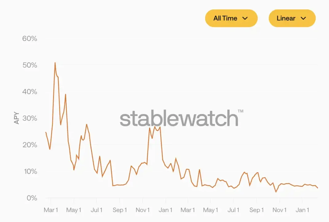 İkinci olarak, uzun süreli pozitif fonlama oranlarının yarattığı arbitraj fırsatları büyük ölçüde Ethena gibi projeler ve kurumlar tarafından değerlendirildi. sUSDe'nin yıllık getiri oranı (APY) 2024 yılının başındaki %40'ın üzerindeyken şimdi %4'ün altına düştü.