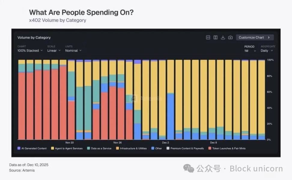 Yukarıdaki grafik, x402'nin son bir ay içindeki işlem hacmini kategoriye (yani ağ kaynağı türüne) göre dağılımını göstermektedir. Kategori tanımlarını görmek için lütfen makalenin sonuna kadar kaydırın.