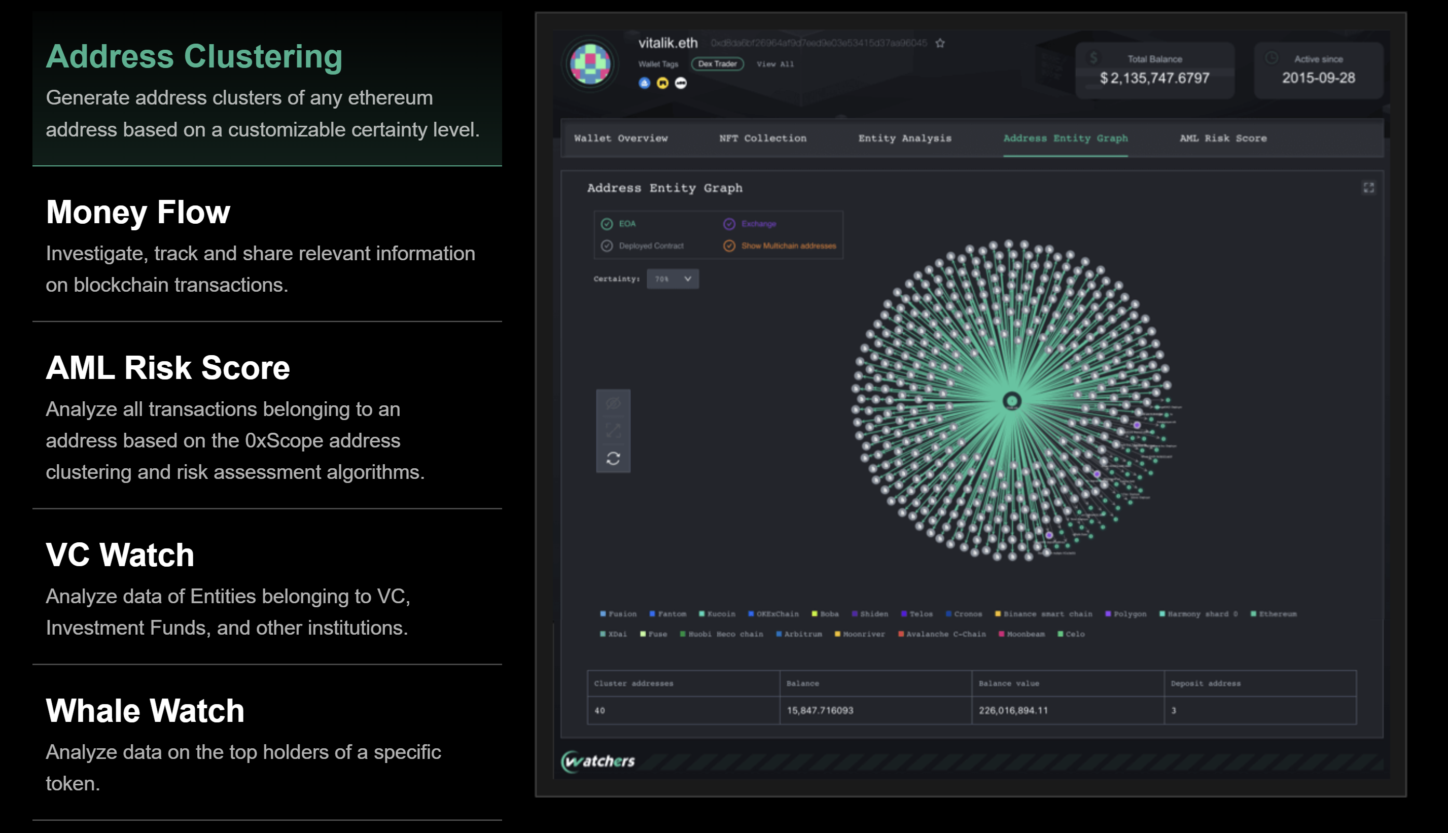 Watchers是0xScope知识图谱支持的第一款产品,它是一个链上数据分析平台。Watchers允许创建有效连接的实时配置文件(实体)。通过Watchers,用户可以获得以下几种服务:
