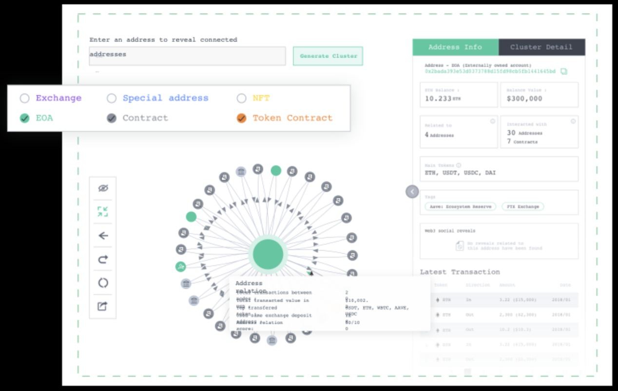 仪表板工具用于专门分析特定实体的仪表板,如风险投资、特定代币的最大持有者、影响者、开发商、拉票、骗局等。所有实体都是由公共标识地址以及高度相关的地址组成的集群。
